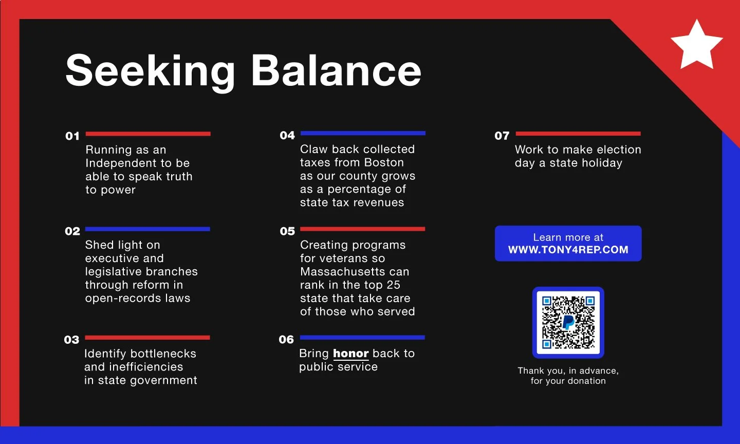 In my private sector job, I look at various processes and try to make them smooth and efficient. I will take my experience to Boston to help make our government work better for the tax paying people.